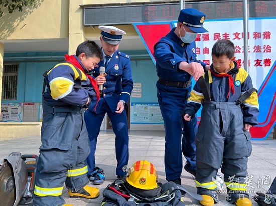 課堂外,消防員將消防車開到操場上,一場生動(dòng)的模擬火場疏散逃生演習(xí),更讓學(xué)生們?nèi)谌肫渲?。操場上,消防員帶領(lǐng)師生認(rèn)識(shí)了不同的消防器材,還帶著孩子們進(jìn)行現(xiàn)場穿戰(zhàn)斗服,操作滅火器……參加體驗(yàn)的孩子穿著消防員服裝,頭頂消防員頭盔、手戴消防員手套。在緊張熱烈的氣氛中,既樹立了孩子們的消防安全責(zé)任感,也讓小“消防員”們了解到更多防火滅火常識(shí)。