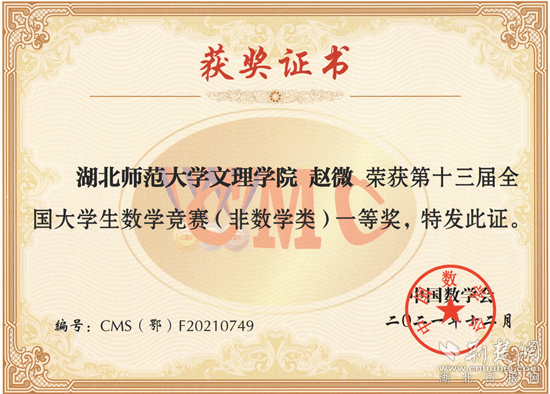荊楚網(wǎng)(湖北日報網(wǎng))訊(通訊員劉婉依)近日,第十三屆全國大學(xué)生數(shù)學(xué)競賽和第十屆湖北省大學(xué)生數(shù)學(xué)競賽成績揭曉。湖北師范大學(xué)文理學(xué)院學(xué)生在國賽中榮獲一等獎1項、二等獎5項、三等獎3項;在省賽中榮獲一等獎2項,二等獎4項,三等獎5項。其中趙微同學(xué)在國賽、省賽中均榮獲一等獎。